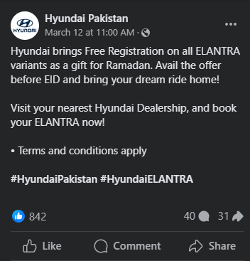 Good news for car buyers in Pakistan! Hyundai is offering a special deal during Ramadan to help you save money. If you buy a Hyundai ELANTRA (a popular sedan known for its speed, fancy technology, and smooth ride) this Ramadan, Hyundai will pay for the car registration fees! This is a great way to save money, especially since registration fees can be expensive.